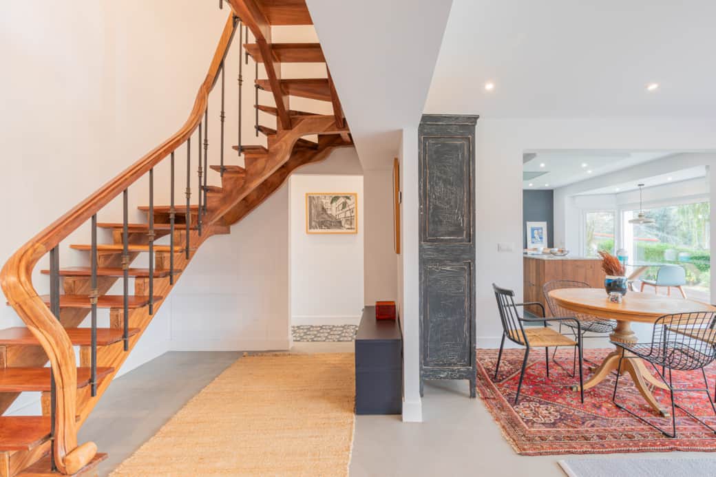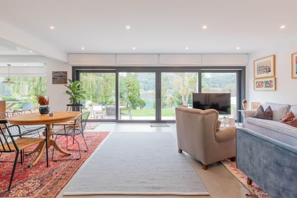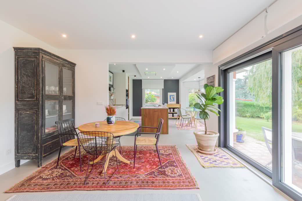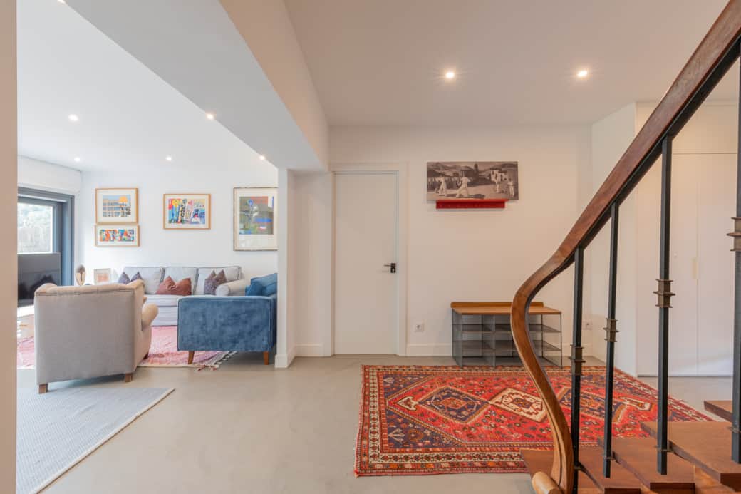 En la planta de abajo se encuentra una de las habitaciones con cama de 1,60 y la zona de limpieza, con fregadera, lavadora, secadora y espacio para el planchado, además de una cocina amplia y completa, de concepto abierto, con isleta en el centro, equipamientos de alta gama con grandes ventanales, sin persianas, con toldos eléctricos y salida directa al jardín. Todos los espacios de la vivienda dan al exterior y tienen vistas al jardín y al estuario, para así disfrutar del tiempo con las mejores vistas. Suelo de hormigón pulido, delicado y cubierto con alfombras y todo en un estilo moderno, tonos blancos y toques nórdicos combinados con muebles de gran calidad que aportan un plus a la vivienda.